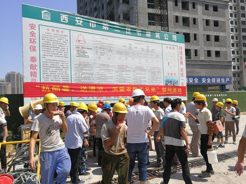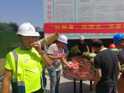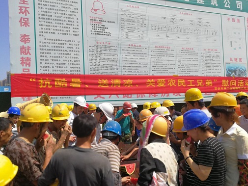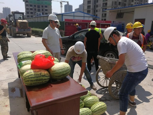 同時為進一步推進保障房項目文明施工管理,7月26日上午,公司黨委、工會、安委會再次對丈八路保障房項目開展“送清涼·享關(guān)愛”防暑降溫慰問活動。將西瓜、綠豆、白糖等防暑降溫用品送達施工一線的工人手中,并叮囑大家一定要嚴(yán)格執(zhí)行高溫措施,注意勞逸結(jié)合和防暑降溫,切勿麻痹大意造成傷害。長期身處一線職工對公司黨委、工會和安委會的關(guān)愛行動表示感謝。