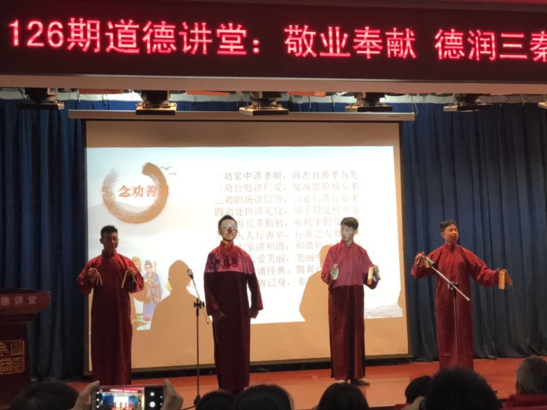 此次講堂共有五個(gè)環(huán)節(jié),圍繞“敬業(yè)奉獻(xiàn),德潤(rùn)三秦”,這一主題,以唱《公民道德歌》、講道德故事、誦道德經(jīng)典、念勸善詞、做道德承諾等形式開展。每個(gè)環(huán)節(jié)的內(nèi)容都豐富多彩,引人深省,讓大家受益匪淺。